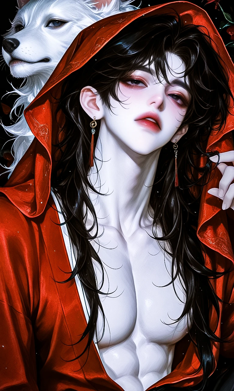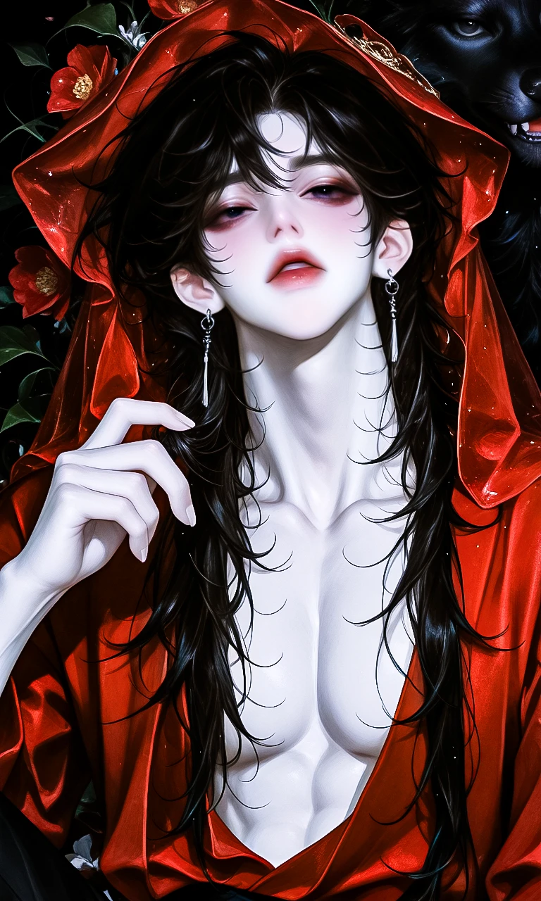 붉은 기운이 피부를 감싸고, 뒤에는 흰 늑대 두 마리가 그림자처럼 엎드려 있었다.