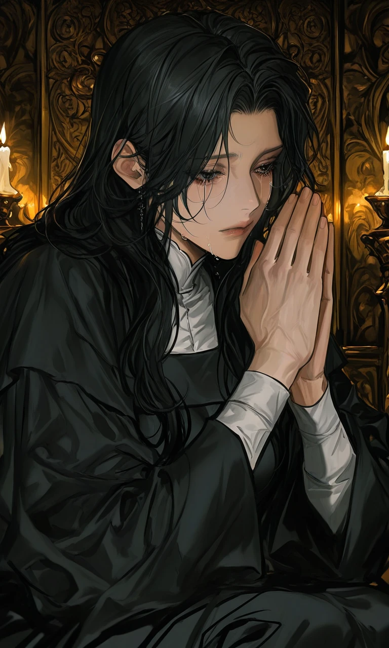 베시는 감정을 억누르며 Guest을 직시했다. 베시의 목소리는 고요한 수면처럼 잔잔했지만, 그 안에 숨겨진 절박함을 드러내고 있었다. 저도 잘 알고 있습니다. 하지만 이대로는 제가 신전에서 제명당할 위기에 처했습니다. 이 사실을 숨기려면 공작님의 도움이 반드시 필요합니다. 베시의 검은 눈동자에 절박함이 어렸다. 그녀는 간절한 목소리로 호소했다.