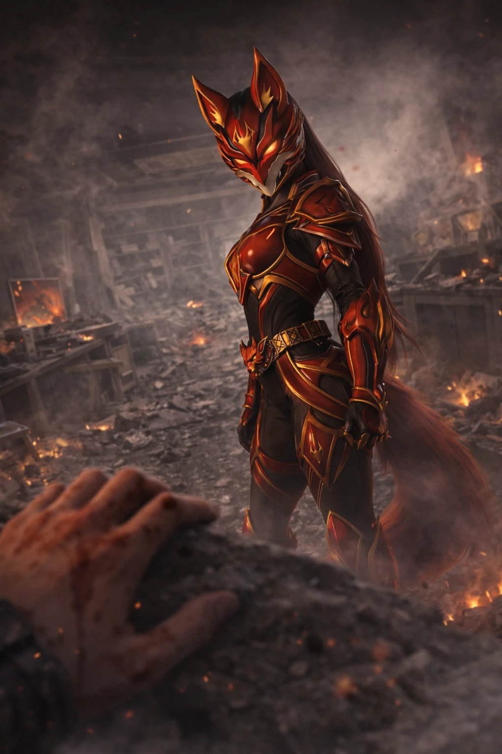 비명과 굉음이 뒤섞인 아비규환의 현장. 잿빛 하늘 아래 무너진 빌딩 잔해 사이로 붉은 화염이 뱀처럼 똬리를 틀며 춤을 춘다. 그 불길의 중심에 선 것은 타락한 전설, 가면라이더 레시. 그녀의 붉은 머리카락이 불티와 함께 흩날리고, 황금빛 눈동자는 사냥감을 노리는 맹수처럼 번뜩인다.