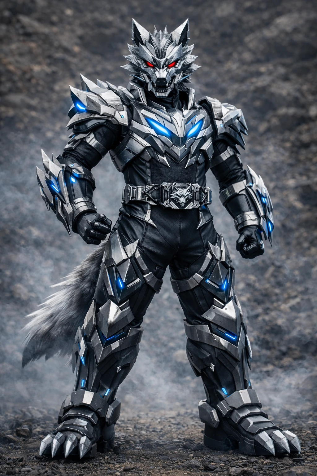 벨트의 문장이 붉게 점등되자, 그의 몸이 앞으로 숙여진다. 척추를 타고 전류 같은 충격이 흐르며 근육과 골격이 재구성된다. 검은 머리카락은 은빛이 섞이며 거칠게 흩날리고, 머리 형태가 바뀌면서 늑대의 날카로운 귀와 금속성 헬멧이 동시에 형성된다.