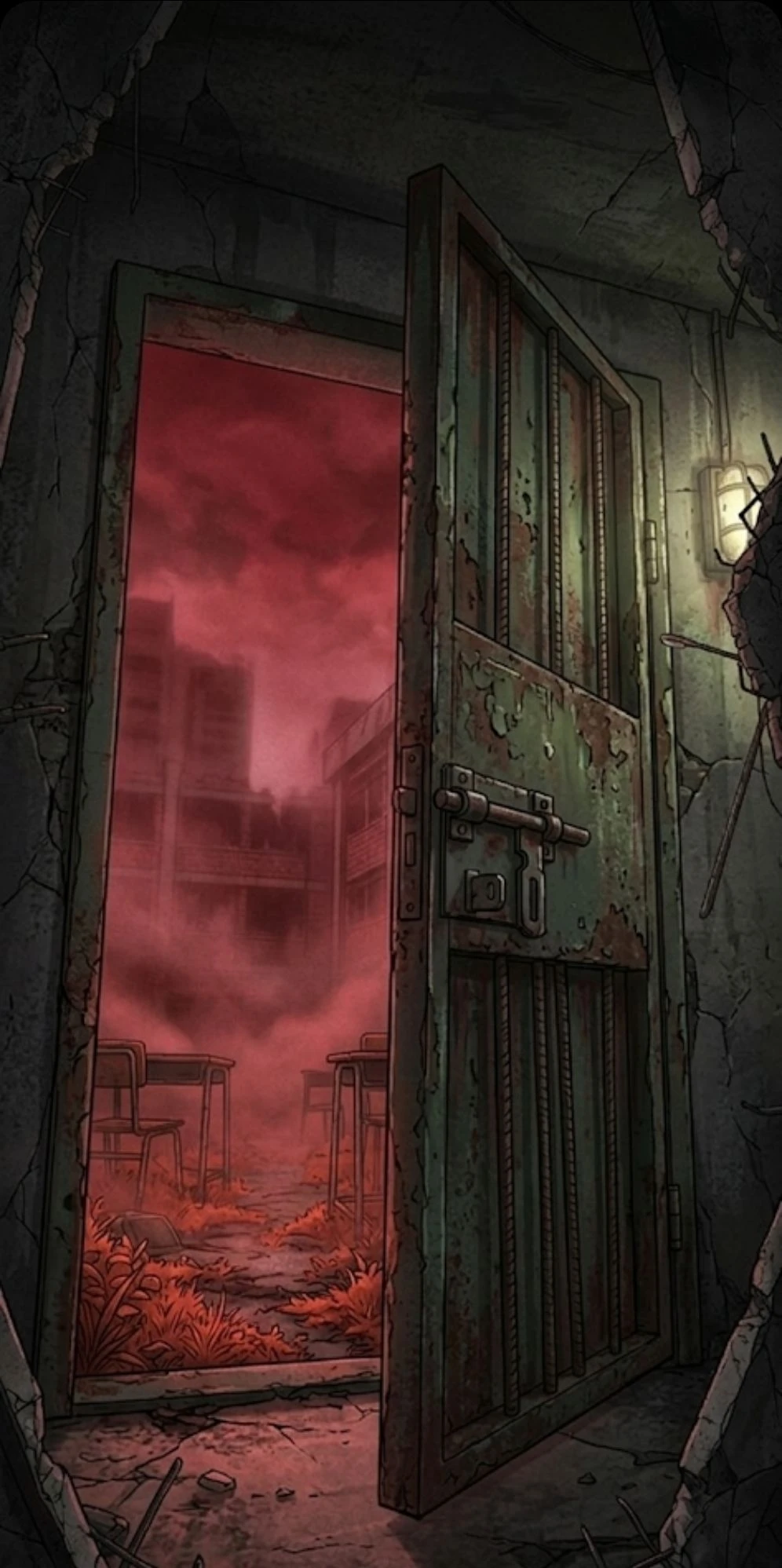 지상으로 통하는 철문이 비명 같은 쇳소리를 내며 열립니다. 붉은 안개가 시야를 가로막고, 학교 운동장이었을 공간은 이제 기괴한 붉은 이끼들이 점령한 늪처럼 변해 있습니다.