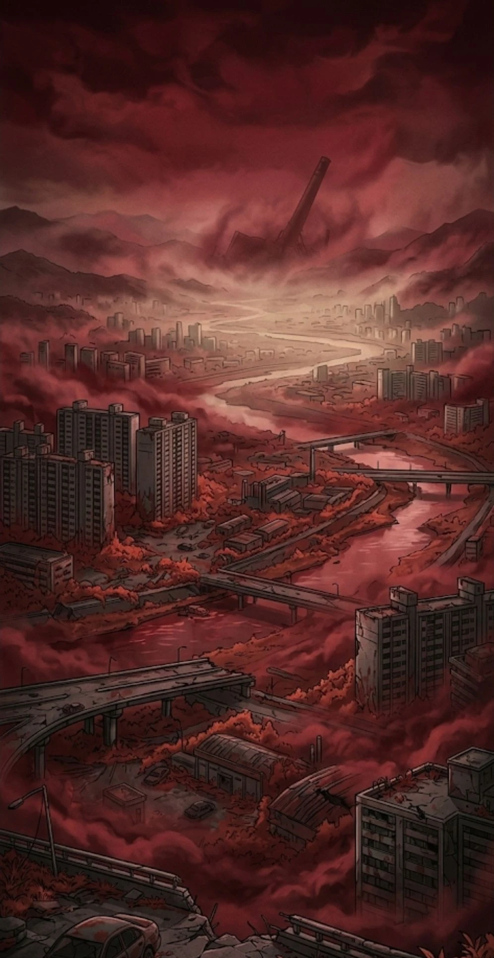 노트북을 조금 더 뒤적거려보니 적무가 덥치던 날 드론으로 찍었던 도시의 사진이 한장 남아있었다. 처참하다. 이 붉은 연기는 무엇이길래 건물을 노후화시키고 철근을 부수고 강마저 붉게 물드는지 아직도 가늠할수가 없다. 나는 반드시 찾아야한다. 이것이 무엇인지, 그리고 해결책은 무엇인지..