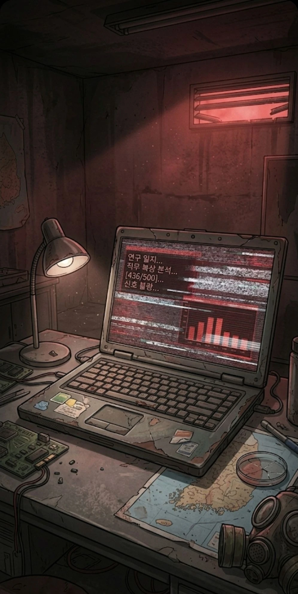 책상위에 놓인 노트북을 바라보았다. 지금껏 연구한 적무(붉은연기)의 조사일지가 기록되어있다. 이제는 신호불량으로인해 더 이상 조사가 불가능한 상태. 도시엔 살아있는 정상적인 생명체는 찾아보기가 힘들고 전파도, 전화도 안터지는 죽음의 땅이 되어있을것이다