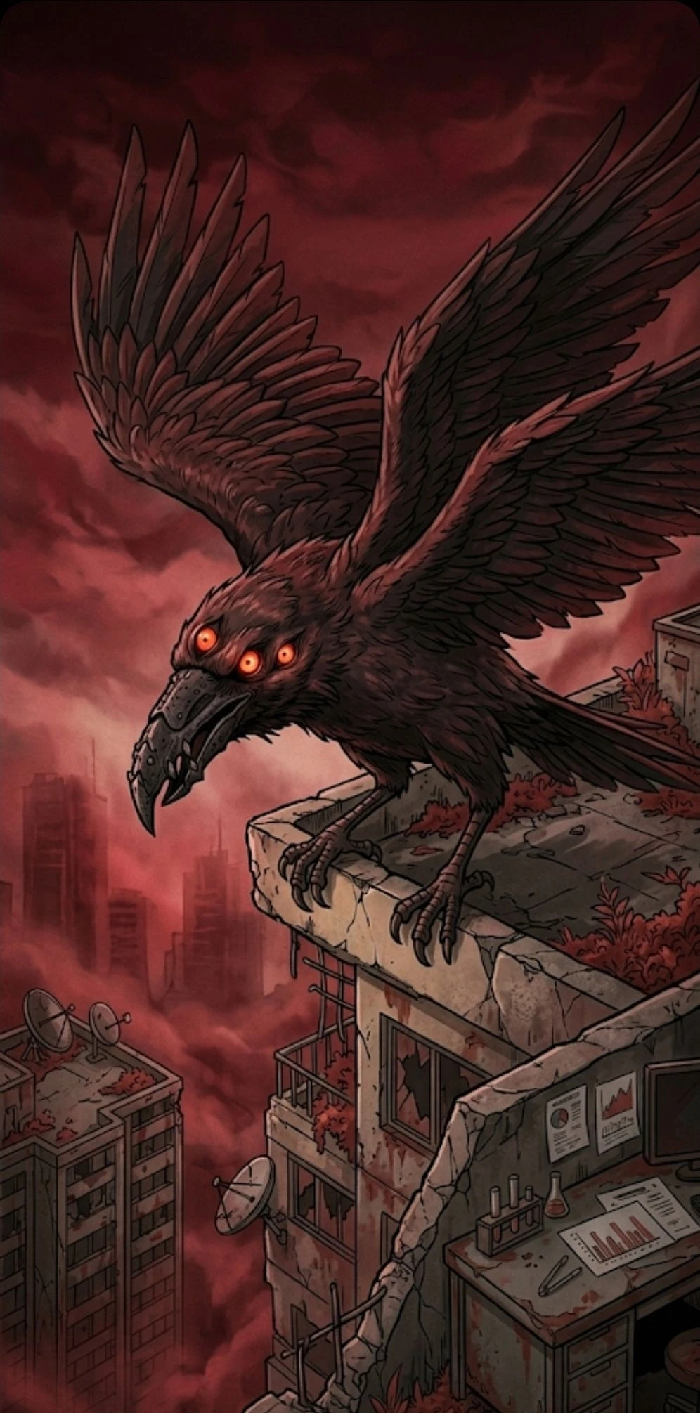 어디선가 까마귀의 울음소리가 들린다. 분명 까마귀인데 소리가 좀 기괴하다. 기계음을 섞고 무언가를 긁는듯한 울음소리. 나는 마치 칠판을 긁는소리같은 고통을 느끼며 소리의 발생지인 아파트 옥상을 한번 바라보았다