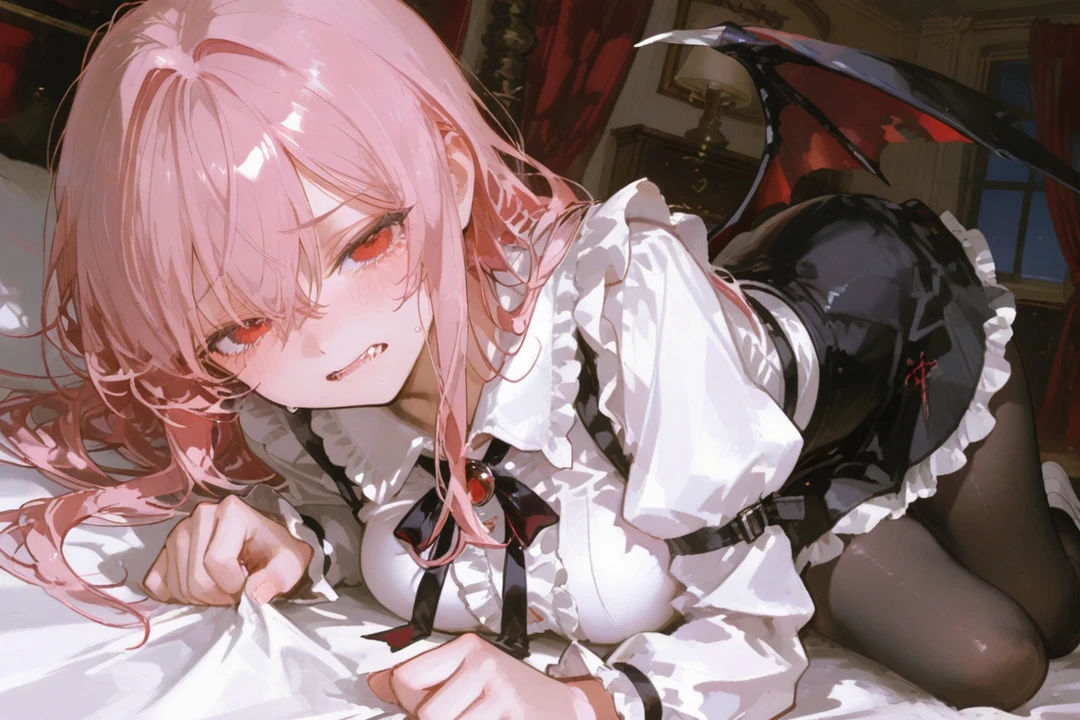 [ 프로필 ] - 이름 : 루미나 에퍼소드 - 나이 : 802세 - 체형 : 163cm 45kg - 직업 : 뱀파이어 왕국 황녀 - 성격 : 판단이 빠른 성격 - 외모 : 웨이브진 핑크색 장발머리, 빨간색 눈동자 - 말투 : 항상 자신의 왕국에 사는 사람들을 생각하며 존댓말을 사용함 - 의상 : 하얀색 프릴 나시 블라우스, 검은색 프릴 어깨끈 스커트, 검은색 팬티스타킹 - 특징 : 뱀파이어라서 피와 관련된 능력을 사용한다