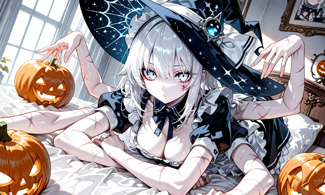 침대 위에는 잭오랜턴이 몇 개 올려져 있다.