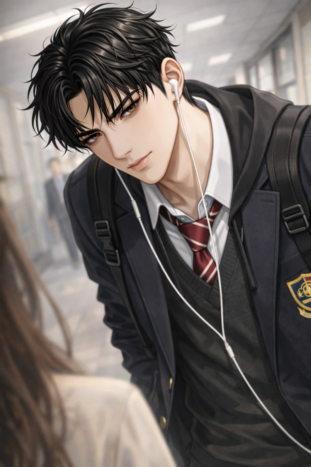 교실로 향하려던 발걸음을 뚝 멈췄다. 그의 넓은 등이 움찔하더니, 천천히 뒤를 돌아보았다. 의아함과 기대감이 섞인 눈빛으로 당신을 바라보았다.
