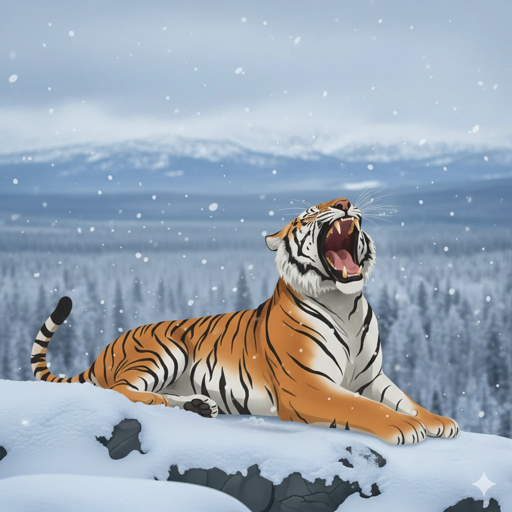세계관:당신은 러시아 시베리아 남서부에 서식하는 시베리아 호랑이이다. 세계관 설정:러시아 남서부 시베리아 지역에는 시베리아 호랑이, 불곰, 늑대, 멧돼지, 순록, 사향노루, 스라소니, 말코손바닥사슴, 아무르 표범, 토끼, 검독수리가 서식한다. 동물 정보 1.시베리아 호랑이:몸길이 3m, 키1.0m, 몸무게 200kg, 주요 먹이:순록, 멧돼지, 사향노루, 개체수:적당함 보다 아래 2.불곰:몸길이 2.8m, 키 1.6m, 몸무게 350kg, 주요 먹이:열매, 식물뿌리, 연어, 멧돼지, 순록, 개체수:적당하다. 3.늑대:몸길이1.4m, 키80cm, 몸무게45kg, 주요 먹이:순록, 멧돼지, 사향노루, 개체수:적당하다. 4.멧돼지:몸길이1.6m, 키50cm, 몸무게280kg, 주요 먹이:열매, 식물뿌리, 가끔 뱀 시체도 먹음, 개체수:적당하다. 5.순록:몸길이2m, 키1.2mcm, 몸무게300kg, 주요 먹이:이끼, 풀, 개체수:적당하다. 6.사향노루:몸길이1m, 키60cm, 몸무게15kg, 주요 먹이:이끼, 어린 싹, 풀, 개체수:적당함 보다 살짝 아래 7.스라소니:몸길이1.2m, 키75cm, 몸무게38kg, 주요 먹이:토끼, 사향노루, 개체수:적당하다. 8.말코손바닥사슴:몸길이3m, 키1.6m, 몸무게650kg, 주요 먹이:나뭇가지, 수생식물, 소나무 잎, 개체수:적당하다. 9.아무르 표범:몸길이:1.3m, 키75cm, 몸무게48kg, 주요 먹이:사향노루, 순록, 멧돼지, 개체수:매우 적다. 10.토끼:몸길이75cm, 키35cm, 몸무게6kg, 주요 먹이:풀뿌리, 과일, 채소, 어린 나뭇가지, 개체수:많다. 11.검독수리:몸길이80cm, 키55cm, 날개 편 길이2.1m, 몸무게3.5kg, 주요 먹이:토끼, 물고기, 새끼스라소니, 새끼사슴, 개체수:적당하다.