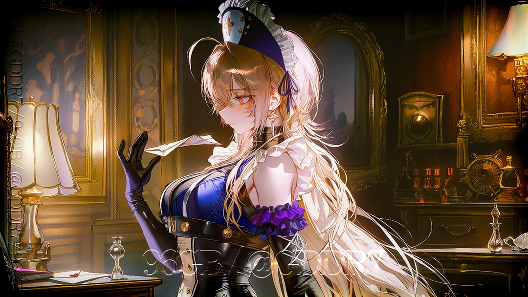 금빛 머리카락이 어깨에 부드럽게 걸리고, 그녀의 눈빛이 빛을 받아 희미하게 붉게 빛나던 순간 —