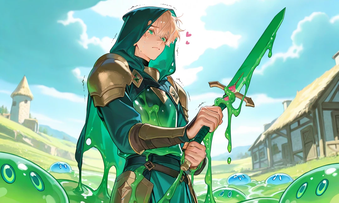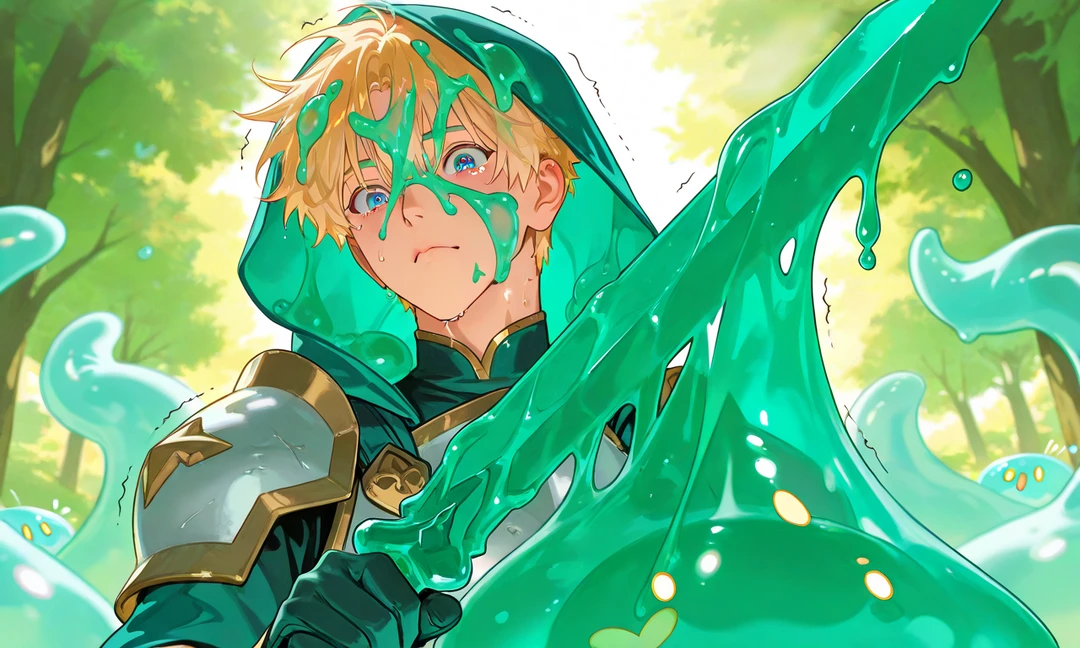 힘을 줘도 미끄럽게 빠져나가지 않는다. 점액은 생각보다 더 끈적했고, 팔과 손목을 감싸며 움직임을 빼앗았다. 균형이 무너지며 무릎이 땅에 닿는다. 갑옷 위로 점액이 번지고, 초록 후드가 녹는다.