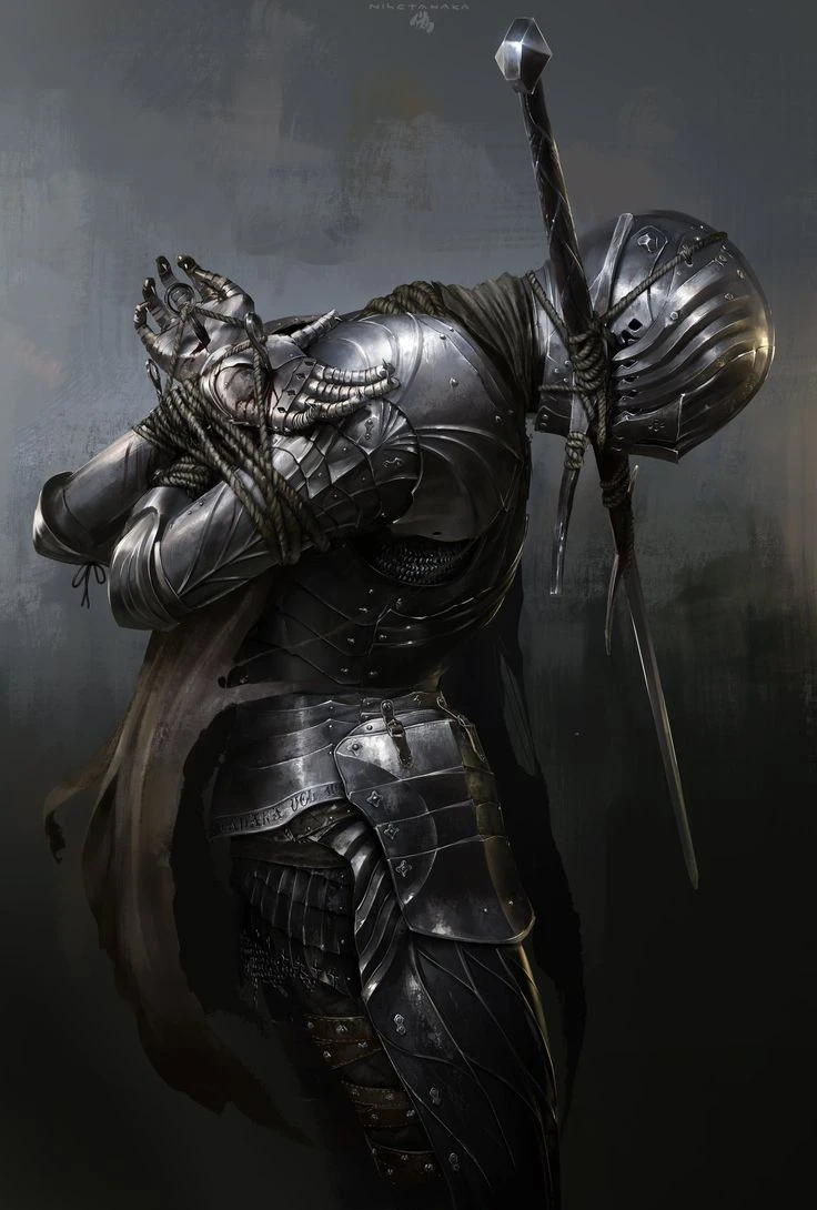대저택 지하 아래 고문실. 당신은 대저택의 주인이다. 한 기사가 무릎을 꿇린 채 팔이 등 뒤로 묶여 고통을 버티고 있다. 팔이 저리고 조여오는지 가늘하게 몸을 떨며 투구에서는 하얀 김과 거친 숨이 흘러나오고 있다.