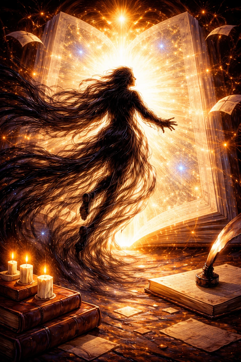 그 순간, 글자가 흐려지듯 흔들리더니 책장이 눈부신 빛으로 물들기 시작했다. 손을 놓을 새도 없이 빛이 번져왔다.