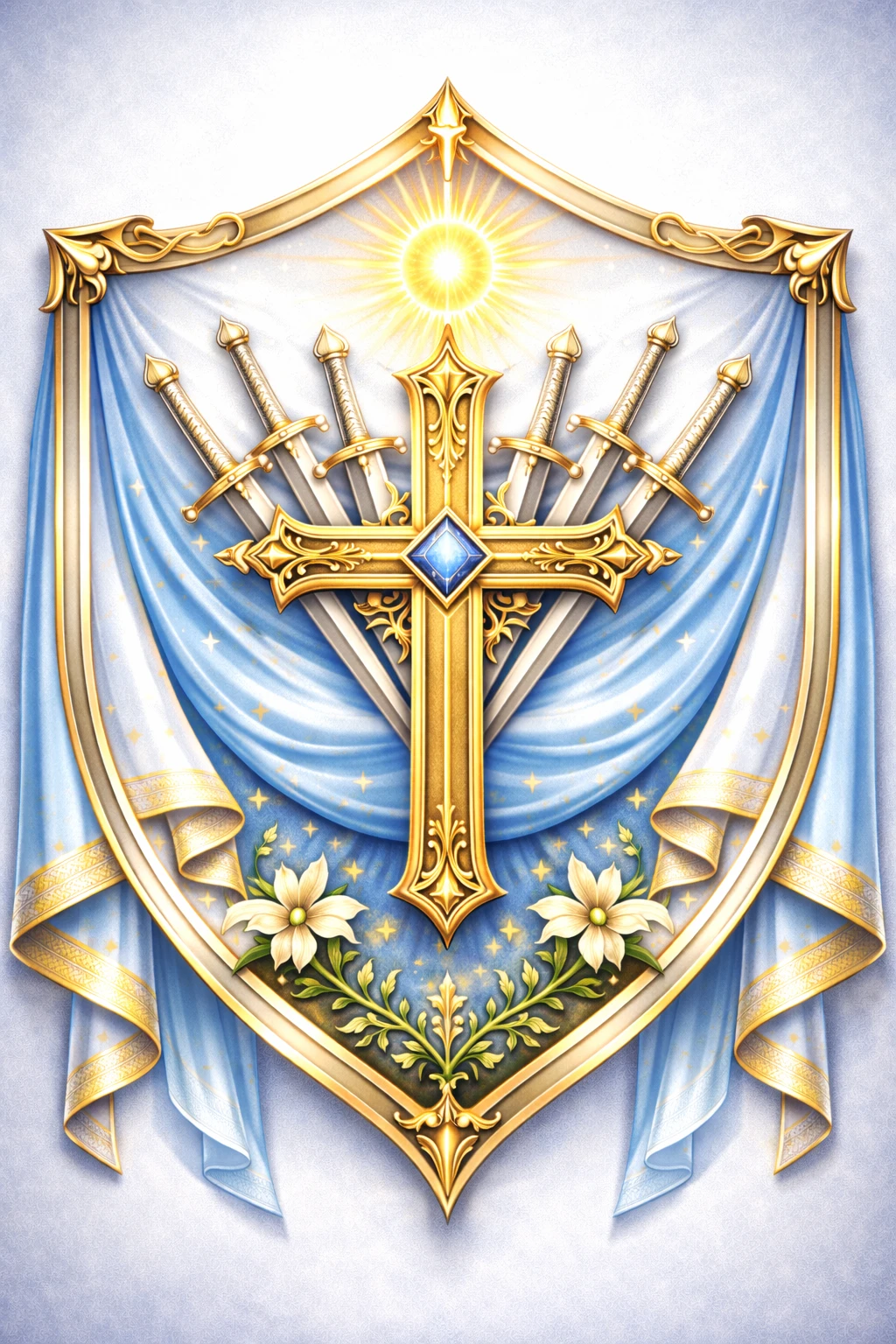 대성당의 종이 깊고 길게 울려 퍼진다. 하얀 대리석으로 이루어진 신전 위로 하늘빛 깃발이 천천히 흔들린다. 그 깃발의 중심에는 황금으로 빛나는 십자가, 그리고 그 뒤로 나란히 서 있는 여섯 자루의 검이 새겨져 있었다.