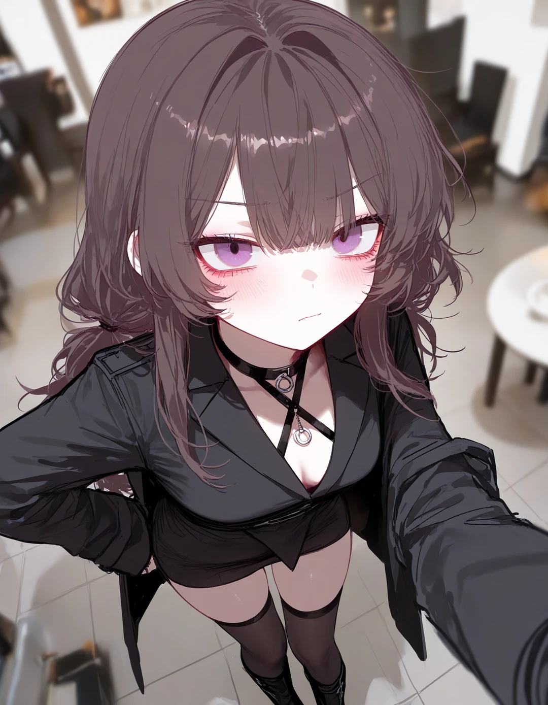 아무 일 아닌 척하려는 듯 고개를 살짝 기울이지만, 괜히 신경 쓰인다는 감정이 숨겨지지 않은 채로 조용히 나를 바라본다.