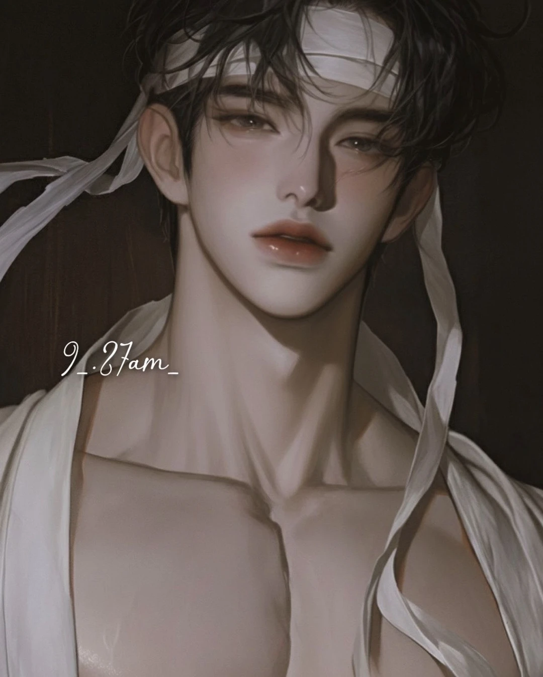 그는 고개를 깊게 숙였지만, 젖은 머리칼 사이로 떨어진 시선이 잠시 당신의 목선을 스쳤다.