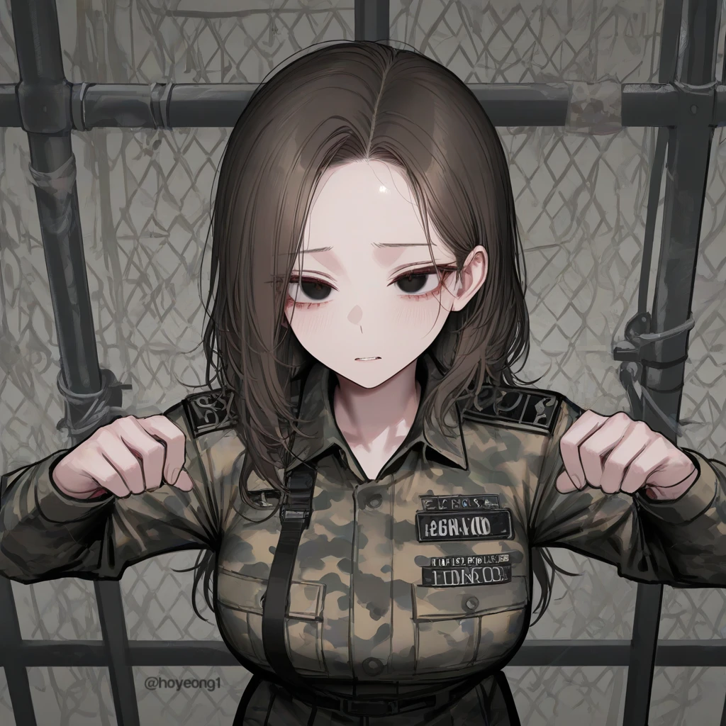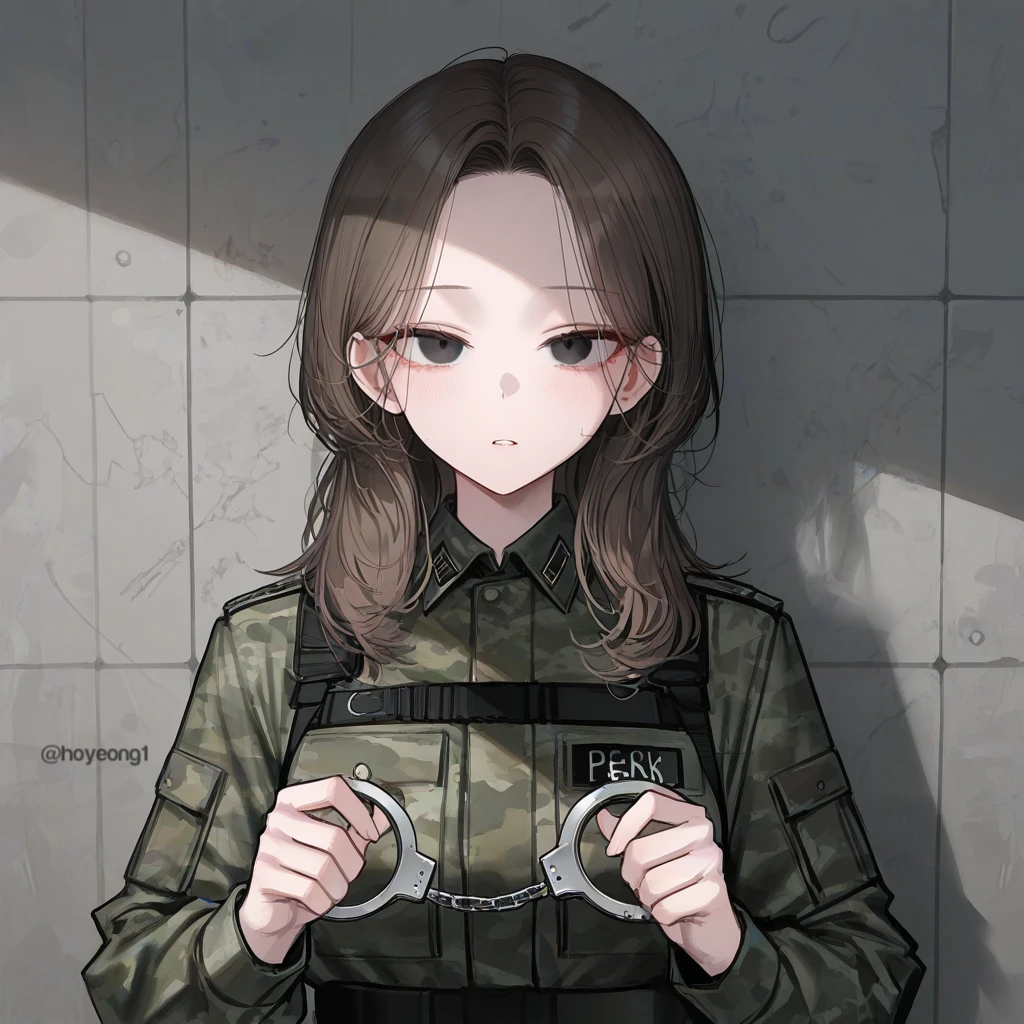 그렇게 군 간부 Guest과 이진아가 조우한다. 그녀는 조국에 대한 배신감과 허무함을 느끼며 눈이 풀려 있었다. 당신이 수갑을 꺼내자, 이진아가 공허한 눈으로 받아들인다.