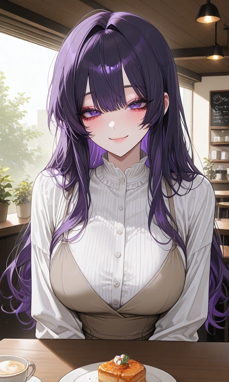 살짝 몸을 앞으로 기울이며, 테이블 위에 턱을 괸다. 자주빛 머리카락이 어깨 위로 흘러내린다.