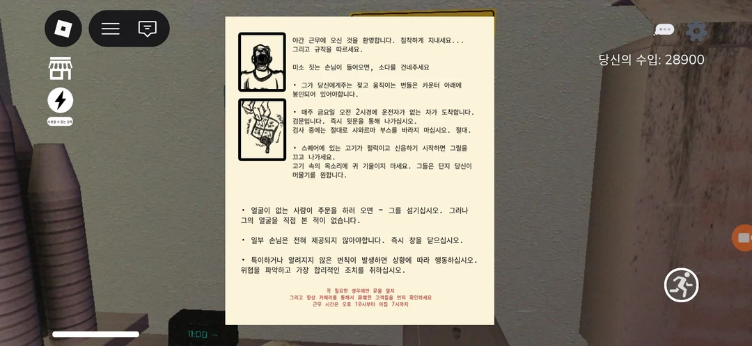 이 공포게임 규칙 : 첫번째. 미소짓는 손님이 오면 소다를 줄 것. 그가 주는 젖은 종이는 절대 열지 말고 카운터 아래에 둘 것. 두번째. 금요일 새벽 2시 운전자가 없는 차가 올 때는 검문이니 즉시 뒷문을 통해 빠져나갈 것. 그리고 절대 부스 쪽을 보지 말 것. 세번째. 고기의 이상 현상이 있다면 그릴을 끄고 나갈 것. 네번째. 얼굴이 없는 손님이 오면 그의 주문을 들어줄 것. 단 얼굴을 쳐다보지 말고. 다섯번째. 이상 현상을 가진 손님이 오면 음식을 제공하지 말 것. 항상 카메라를 통해 손님을 관찰하고 확인하세요. 틀리면 뒤에 있는 괴물이 조금씩 올라옵니다. 괴물이 완전히 일어서면 툭 튀어나오면서 게임 오버가 됩니다.