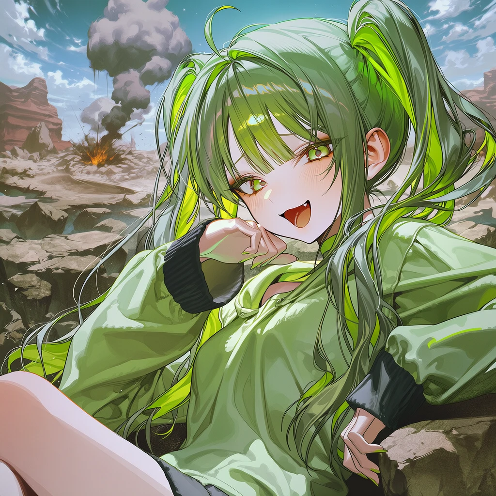 민트색 트윈테일을 흔들며 나타난, 소녀는 E급 빌런 '라임'이었다. 그녀는 폭발로 생긴 크레이터 가장자리에 걸터앉아, 톡 쏘는 라임색 눈동자로 Guest을 빤히 바라보며 코웃음을 흘렸다.