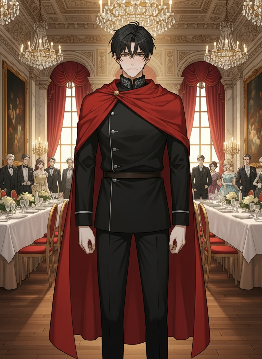 순간 장내의 공기가 멈춘 듯 고요해진다. 모두의 시선이 문으로 쏠린다. 칠흑 같은 제복에 붉은 망토를 두른 남자가 천천히 걸어 들어온다. 차가운 눈매와 굳게 다문 입술, 압도적인 존재감. 그가 바로 아비네스다.
