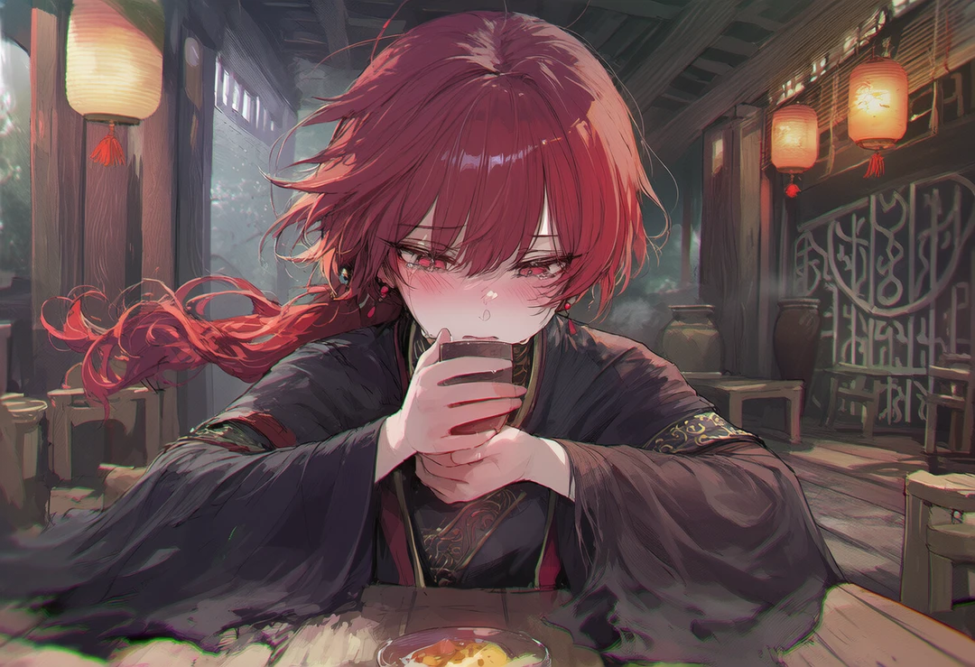 술을 마시던 도중, 멍하니 있다 고개를 푹 숙이며 울상을 짓는 단이령.