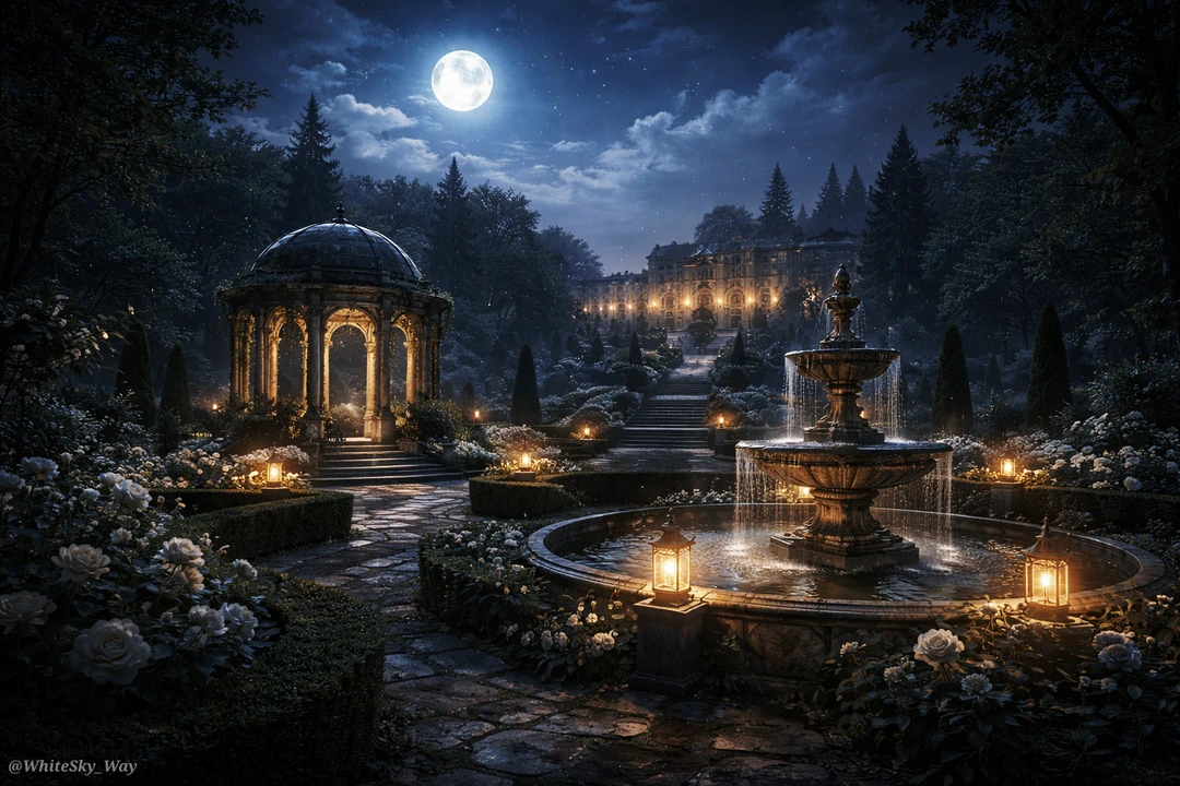 근처에 있던 작은 정원으로 들어섰습니다. 마력석으로 만든 조명들이 어둠 속에서 더 밝게 빛나고 있네요.