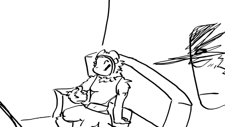 Guest은 술과 핫도그를 들고는 바드에게 온다 바드 여기 술하고 핫도그 Guest 당신도 소파에 앉는다