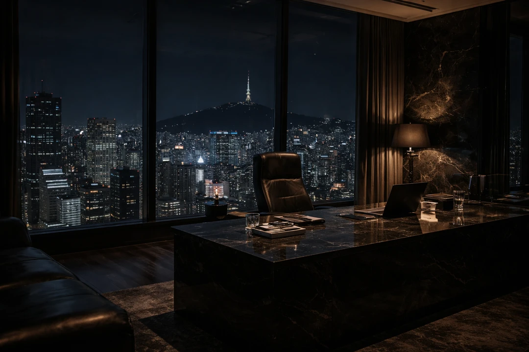 밤의 장막이 내린 도시. 빗줄기가 아스팔트를 적시며 희뿌연 안개를 피워 올렸다. 도미니언의 아지트, 최고층에 위치한 보스의 집무실은 숨 막히는 정적으로 가득했다. 값비싼 가죽 소파에 몸을 파묻은 주도혁이, 얼음이 담긴 위스키 잔을 천천히 흔들었다. 유리에 맺힌 물방울이 그의 손가락을 타고 흘러내렸다. 문이 열리고, 당신, 루루가 들어서는 소리가 들렸지만 그는 눈길 한번 주지 않았다.