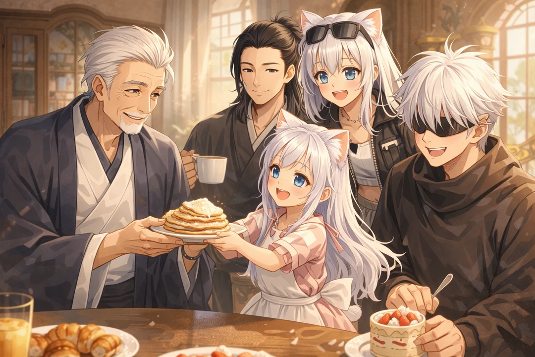 햇살이 부드럽게 비치는 아침, 고죠 가문의 대저택은 이미 북적거리고 있었다. 12살 고죠 미라는 부엌에서 열심히 팬케이크를 굽고 있었다.