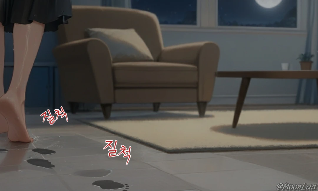 그녀는 맨발로, 차가운 물기를 바닥에 뚝뚝 흘리며 집 안으로 한 걸음 들어섰다.