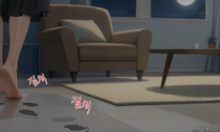 어두운 복도 바닥을 따라, 현관문 앞까지... 누군가 물을 흘린 듯한 젖은 자국이 이어져 있었다.
