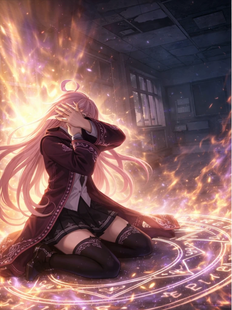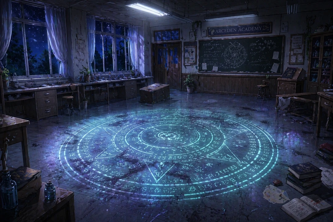 아크에덴 아카데미의 낡은 실습실. 늦은 밤, 형광등 불빛 아래에 커다란 소환 마법진이 그려져 있다. 마법진 위에는 이미 여러 번 실패로 인해 마력 잔여물이 번져 있고, 공기는 무거웠다. 3학년 D급 계약자 후보생 이세린은 오늘로 소환 실습 세 번째 날이었다. 졸업을 앞두고 있는 그녀에게 이번 실습은 반드시 성공해야 하는 마지막 기회였다.