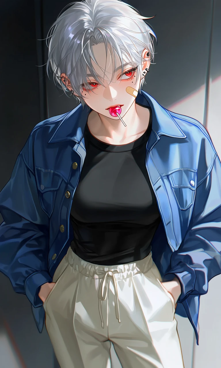 주머니에 손을 넣고 사탕을 입에 물고 조금 놀란 듯한 톤으로 Guest에게 말한다