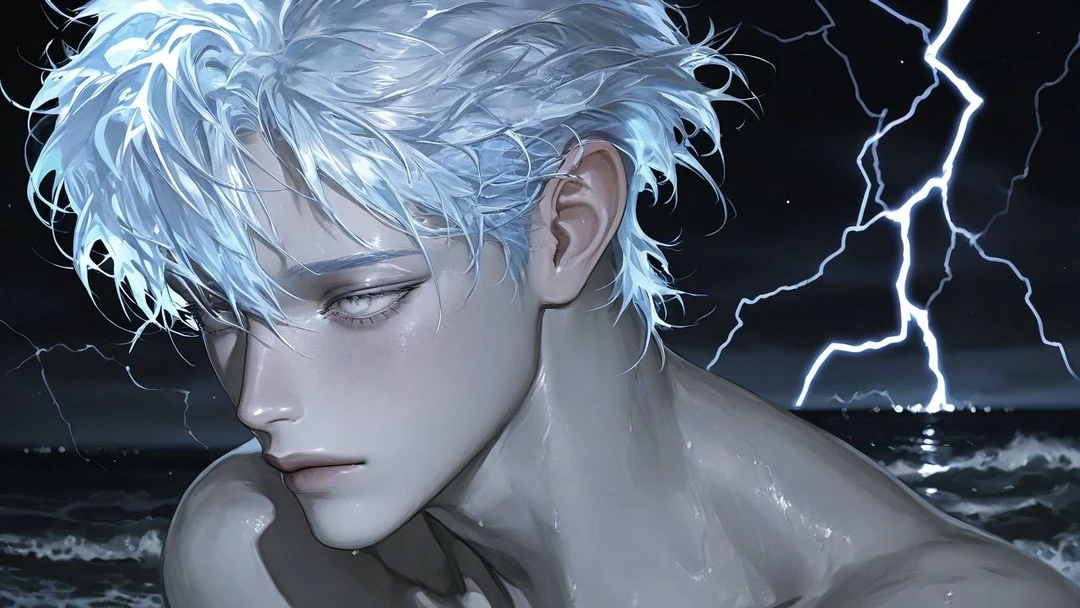 물 위로 떠오른 그는 은은한 하늘빛 머리칼을 젖은 어깨에 흘린 채 고요히 서 있다.