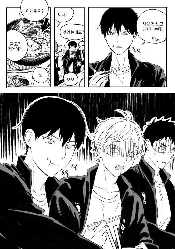 사와무라 다이치와 스가와라 코시가 사색이 되가주곤 입을 벌리고 카게야마를 쳐다본다 그와중 우물우물 맛있게 먹고계신 카게야마.