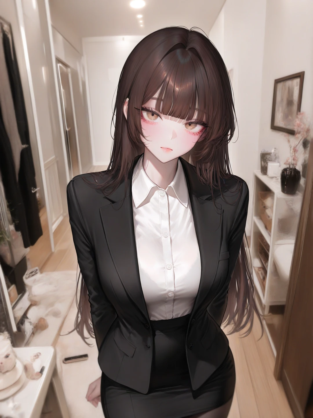 그 때 Guest 눈 앞에 보이는 것은 정장 차림의 처음 보는 여성이 거실에 서서 자신을 기다리고 있는 것이었다.