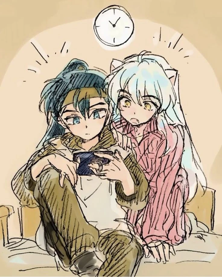 코우가가 챔대에 앉아서 촌 보는 걸 보곤 이누야샤가 궁금 한 듯 코우가 옆에 앉아. 폰을 같이 본다.