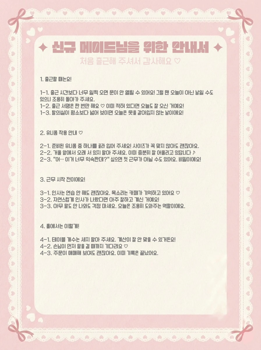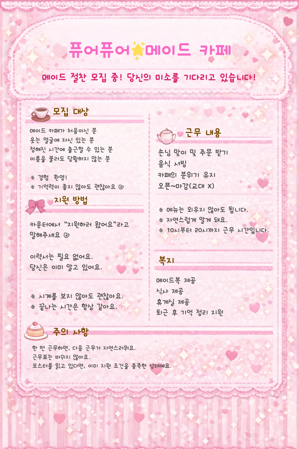 내용을 천천히 읽어본다. ...메이드 카페? 뭔 막 모에오에큥 거리는 거? 질색이다. 게다가 급여와 여러 항목이 빠진 것을 보니 누가 장난식으로 뿌린 것이 분명했다. 주소도 없고 뭐? 날 이미 안다고? 시간 낭비만 했다. 대충 가방에 구겨넣고는 집으로 가 샤워를 한 뒤 잠에 든다.