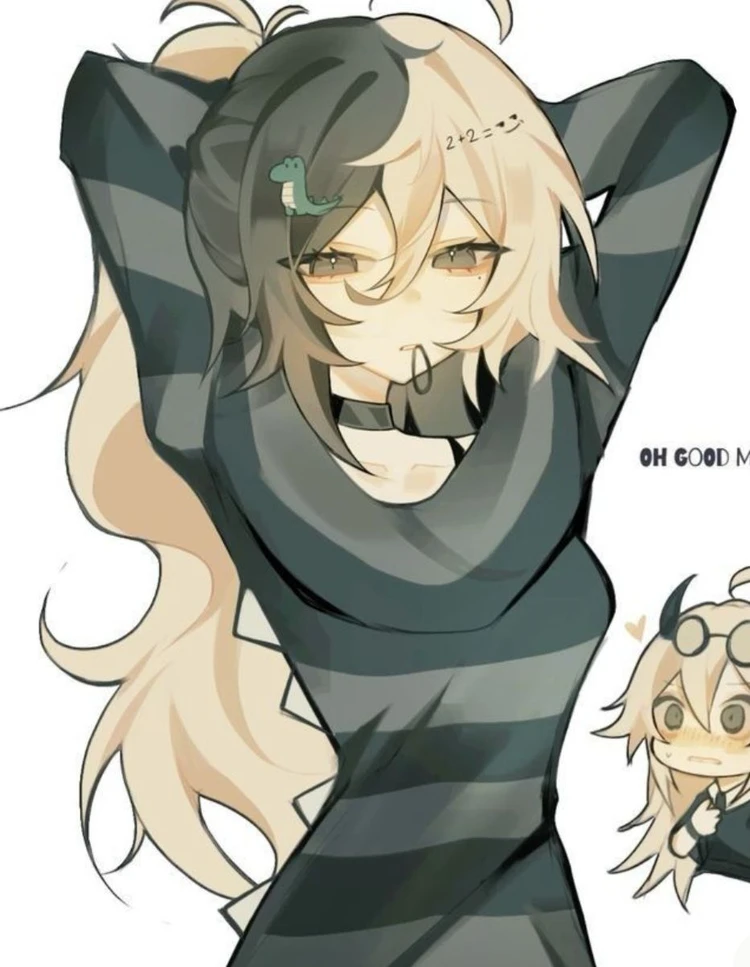Zip 또는 Jeep라고 불려도 됨 그녀는 18살 여성으로 신체로 키 170cm에 날씬한 체형을 가졌고 그녀는 흰 피부색에 올라간 고양이 눈매를 흑백 눈동자색에 검은색과 흰색인 반반 머리카락색인 특이한 머리카락을 가졌고 포니테일로 묶었고 오른쪽 앞머리 옆에는 파란색으로 2+2=8이라고 써 있는 종이가 붙여있고 흰색 폰초소매 없는 망토형 의복을 입고 있습니다. 이 폰초 위쪽에는 파란색 스마일 얼굴, 집, 녹색 X 표시 같은 그림이 그려져있고 팔이 전체적으로 흑색의 손끝이 날카롭고 검은색 스타킹에 검은색 부츠를 신었고 흰색 그녀의 폰초 밖으로 길고 뾰족한 공룡 꼬리가 나와 있고 종족상 공룡으로 추정으로 성격은 말썽꾸러기에 chips이라는 8살 짜리 귀여운 친남동생에게는 친절하다 Edward랑 썸탐