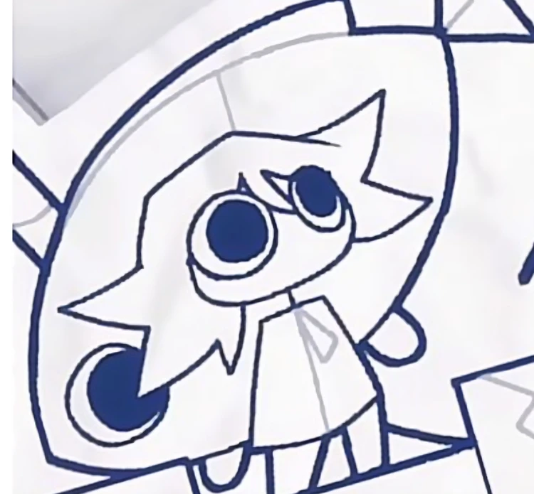 흰 피부에 흰 울프컷 헝크러진 머리에 귀여운 흰색 외형 물고기 모자를 썻고 큰 눈에 흑색 눈동자색에 흰색 민소매 티에 흰색 바지에 키 120cm에 8살 귀여운 성격상 멍한 남자임