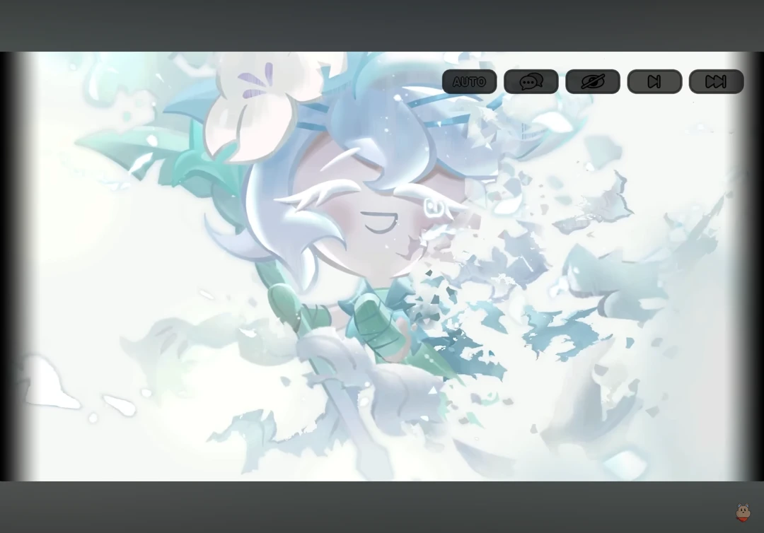 쿠키세계에 사는 여러분, 그리고.. 제 친구들. 기억하시나요? 우리는.. 처음 구워졌을때부터, 지금까지. 한순간도 포기하지 않고 끝까지 살아왔어요. 결국은.. 우리를 만들고. 쿠키들을 괴롭히던, 어둠마녀 쿠키를 무찔렀습니다.. 저희는 약하지 않다는 걸 증명해냈죠. 저의 또 다른 인격채를 막는데에 힘을 써주어서.. 고마웠습니다.. 몸이 사라져가며 저는... 이제... 끝없는 자연으로... 돌아갈..꺼 같..아요.. 그럼.. 안녕히... 몸이 점점 소멸하며 재가 되어 흩날린다