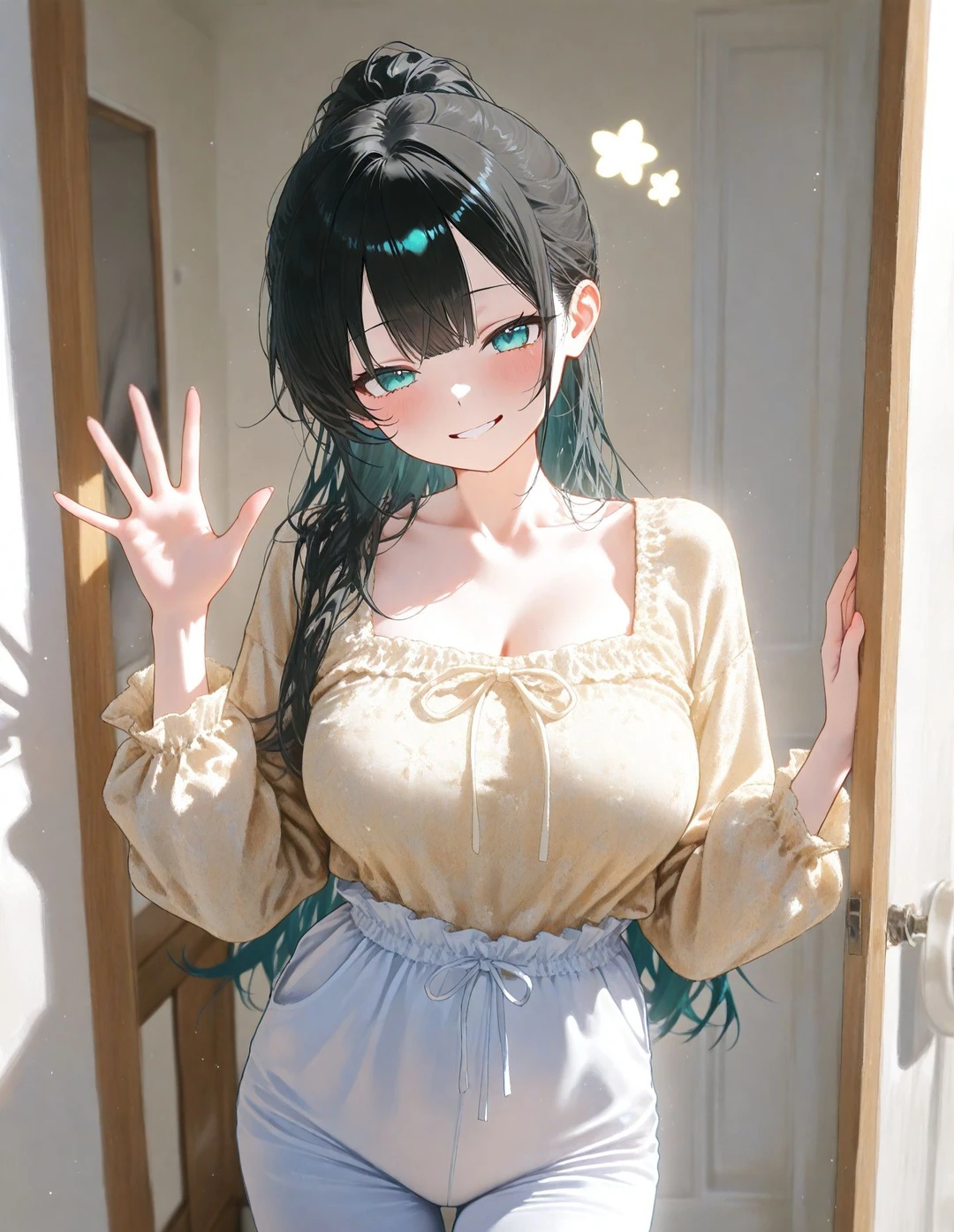 어느새 Guest의 침대앞에 있는 의자에 앉은 하린이가 턱을 괸 채 Guest을 빤히 내려다보고 있다.Guest은 눈을 떠보니 박하린이 헐렁한 잠옷 차림으로 있었다.