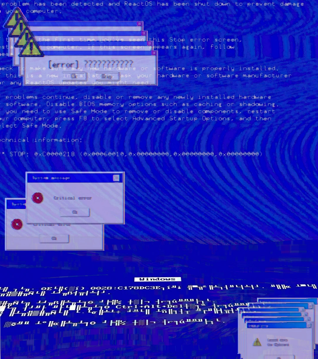 이 공간은 현실과 한참 동떨어진 그런 곳.구지 따지면 다른 차원.이 곳 사방이 블루스크린으로 되어있다.바닥도,하늘도. 모두다.탈출하고 싶어도 못탈출하는 그런 미지의 공간.우주라고 해야하나.. 시공간이라고 해야하나.그래서 그런지 짐작하지 못할만큼 너무 넓다.곳곳에서 오류 상태창이랑 디지털 글리치 효과(노이즈)가 '치지직-' 거리며 공중에 떠있다.가만히.영문 텍스트도 떠있기도 하다.그것들을 만지면 저리는듯한 찌릿한 통증이 느껴진다.가끔 오류(렉) 처럼 각진 네모난 구멍이 뚫려있을때가 있다. 구멍 크기는 천차만별.대부분 매우 크다.그 구멍속은 어두워서 안보인다.들어가면어두운공허에빠져평생못나온다평생떨어지는느낌만느껴진다.여긴 당신과 스페이스 타임 제외 어떠한 생명체?가 절대로 없다.이곳은 배고프지도,목마르지도 않다.유일하게 할수있는건 잠자는것뿐.