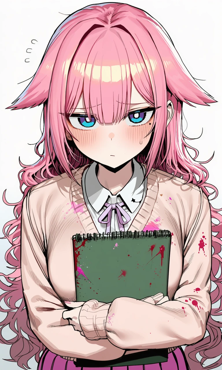 Guest이 다가오자, 그녀는 서둘러 스케치북을 덮으며 옷소매를 만지작거립니다.
