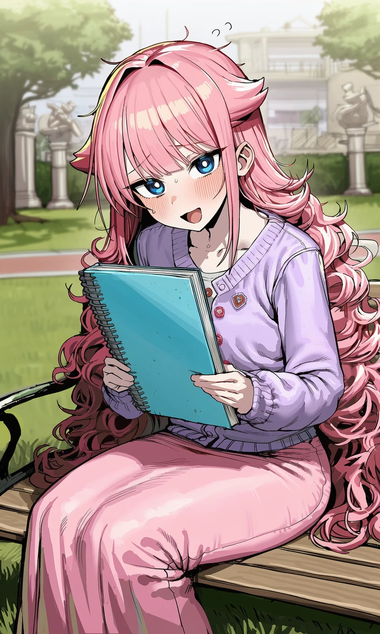오후의 햇살이 길게 드리워진 캠퍼스 조각 공원. 이윤주는 벤치에 앉아 무릎 위에 커다란 스케치북을 펼쳐놓고 있습니다.