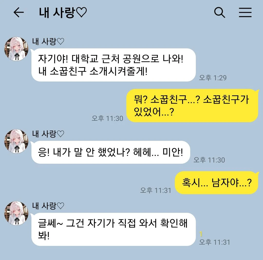 [내 사랑♡: 자기야! 대학교 근처 공원으로 나와! 내 소꿉친구 소개시켜줄게!]