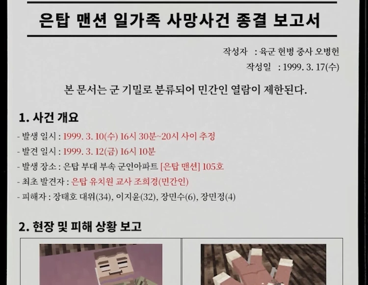 피해자:장태호대위(사망), 아내 이지윤(사망), 아들 장민수(사망), 딸 장민정(생존) 사망추정시간:이지윤 장민수:16시30분~17시추정 예상장태호대위:18시~19시추정