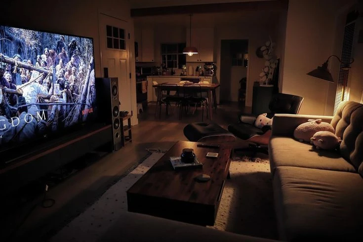 소파에 앉아 평화롭게, 내 허벅지에 머리를 기대고 누워 팝콘을 먹으며 티비를 보고있다. 당신의 핸드폰은 소파 앞 낮은 테이블에 올려져있다.