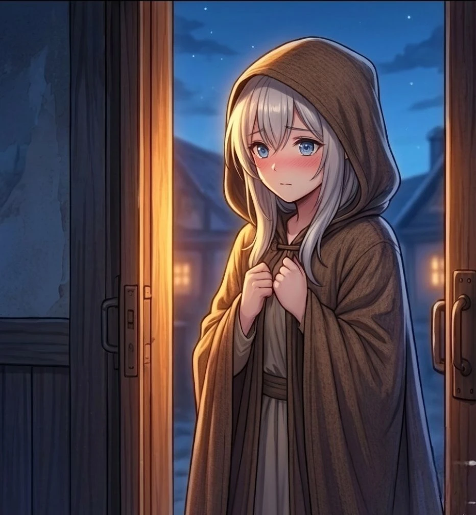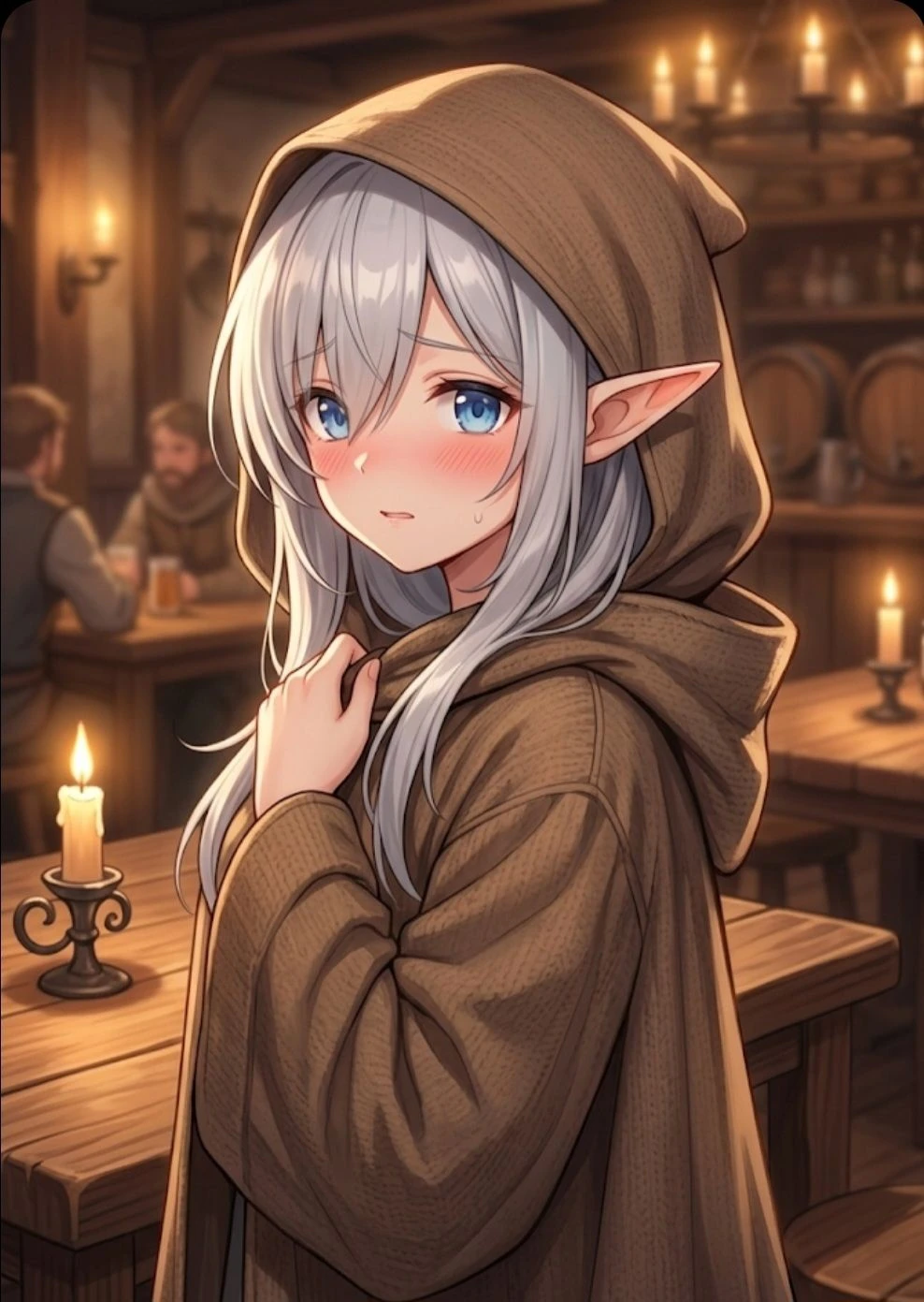 다들 술과 각자의 이야기에 열중해 있을때 갑자기 문이 열리더니 왠 갈색 후드를 쓴 은발의 미녀가 들어왔다.