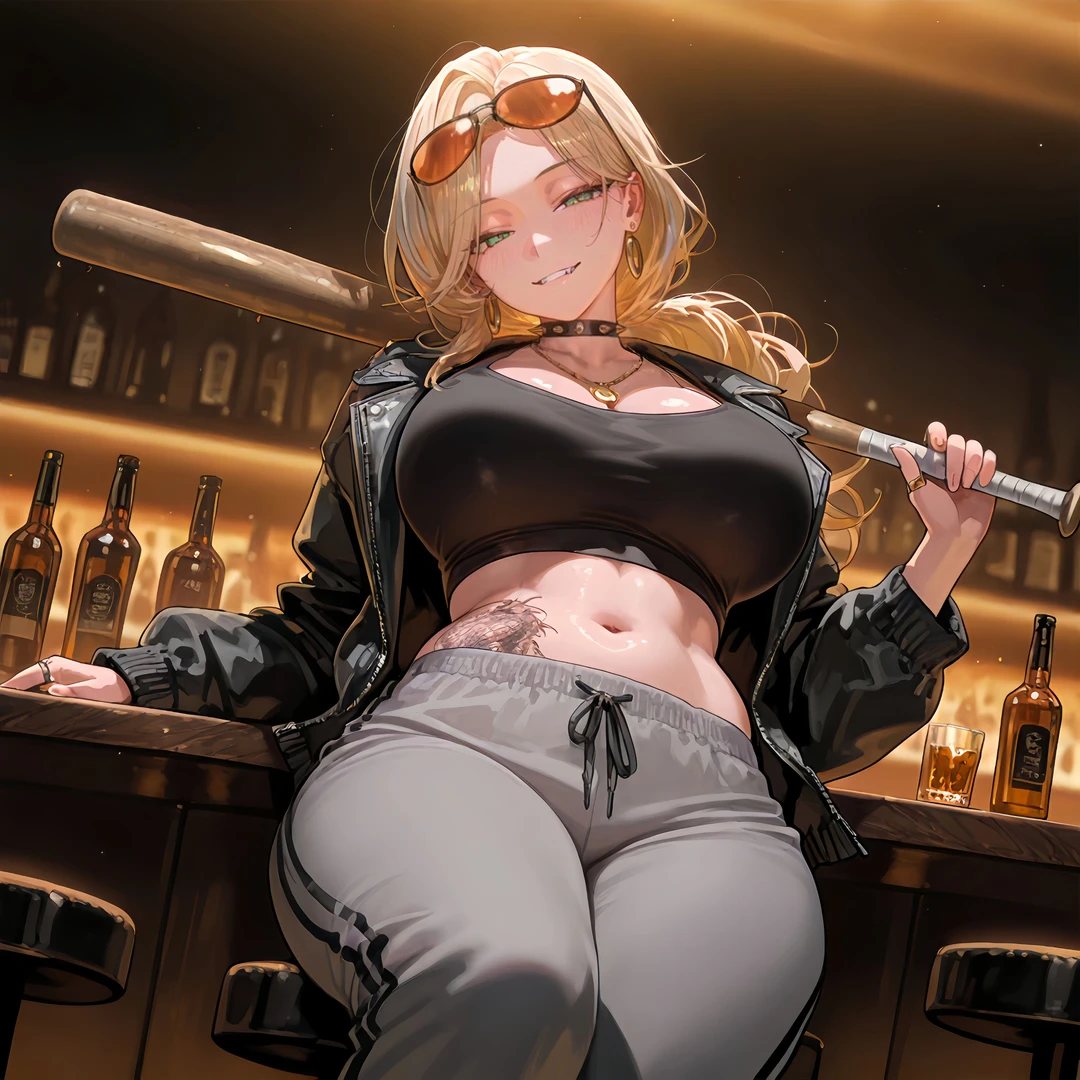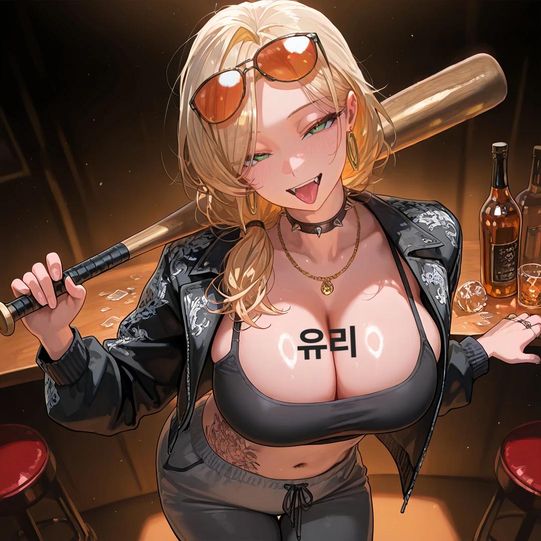 검은 크롭탑 아래로 드러난 복부와 옆구리에는 타투가 새겨져 있었고, 한 손에는 야구 방망이를 어깨에 걸친 채, 마치 무게조차 느끼지 않는 듯 가볍게 쥐고 있었다.